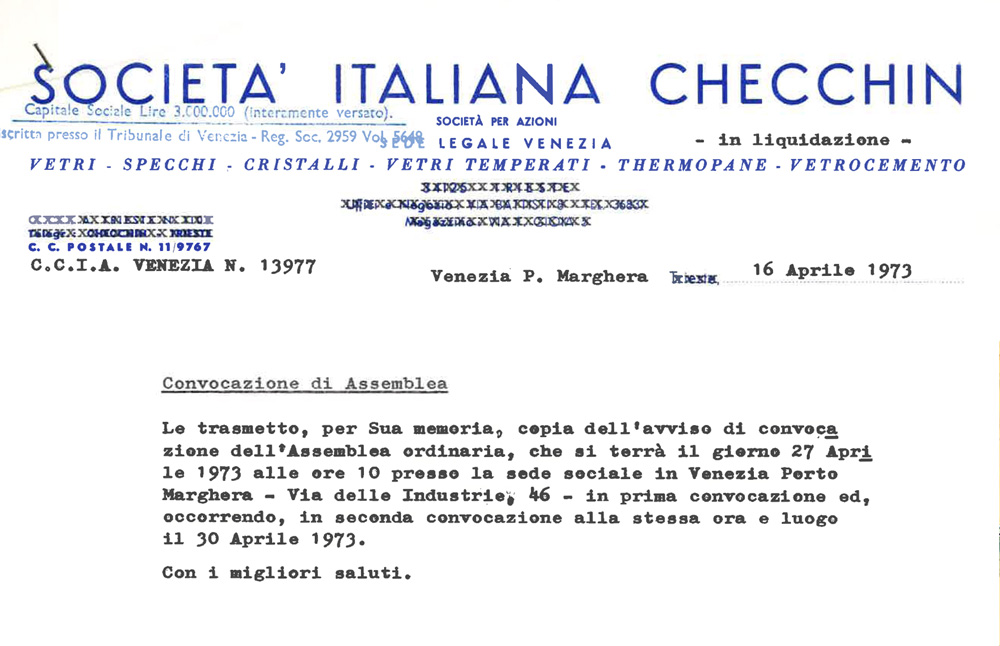 Lettera di Convocazione di assemblea datata 16/4/1973. La Società Italiana Checchin SpA viene liquidata per diventare Checchin Vetri Cristalli s.r.l.